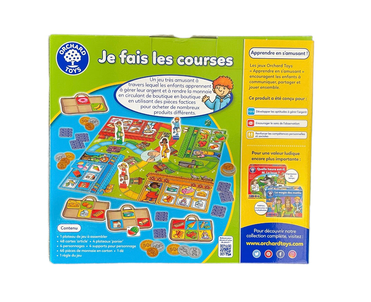 Contenu : 1 plateau de jeu à assembler (4 pcs), 48 cartes "articles", 4 cartes "paniers", 4 personnages, 4 supports pour personnages, des pièces de monnaie factices, 1 dé à