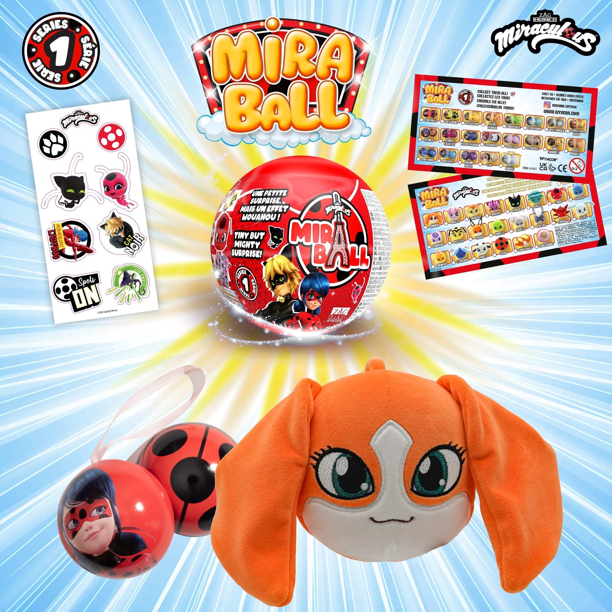 - Chaque Miraball contient 1 boule en métal de collection avec ruban + 1 peluche + 1 page d'autocollants pailletés + 1 brochure de collection.